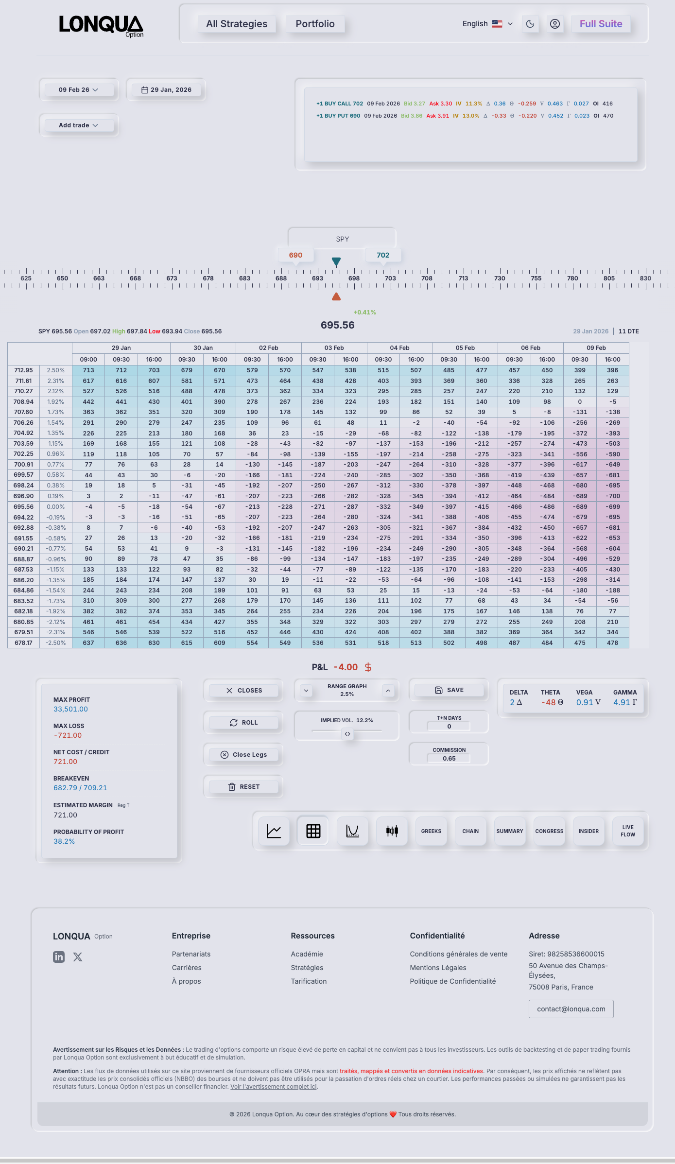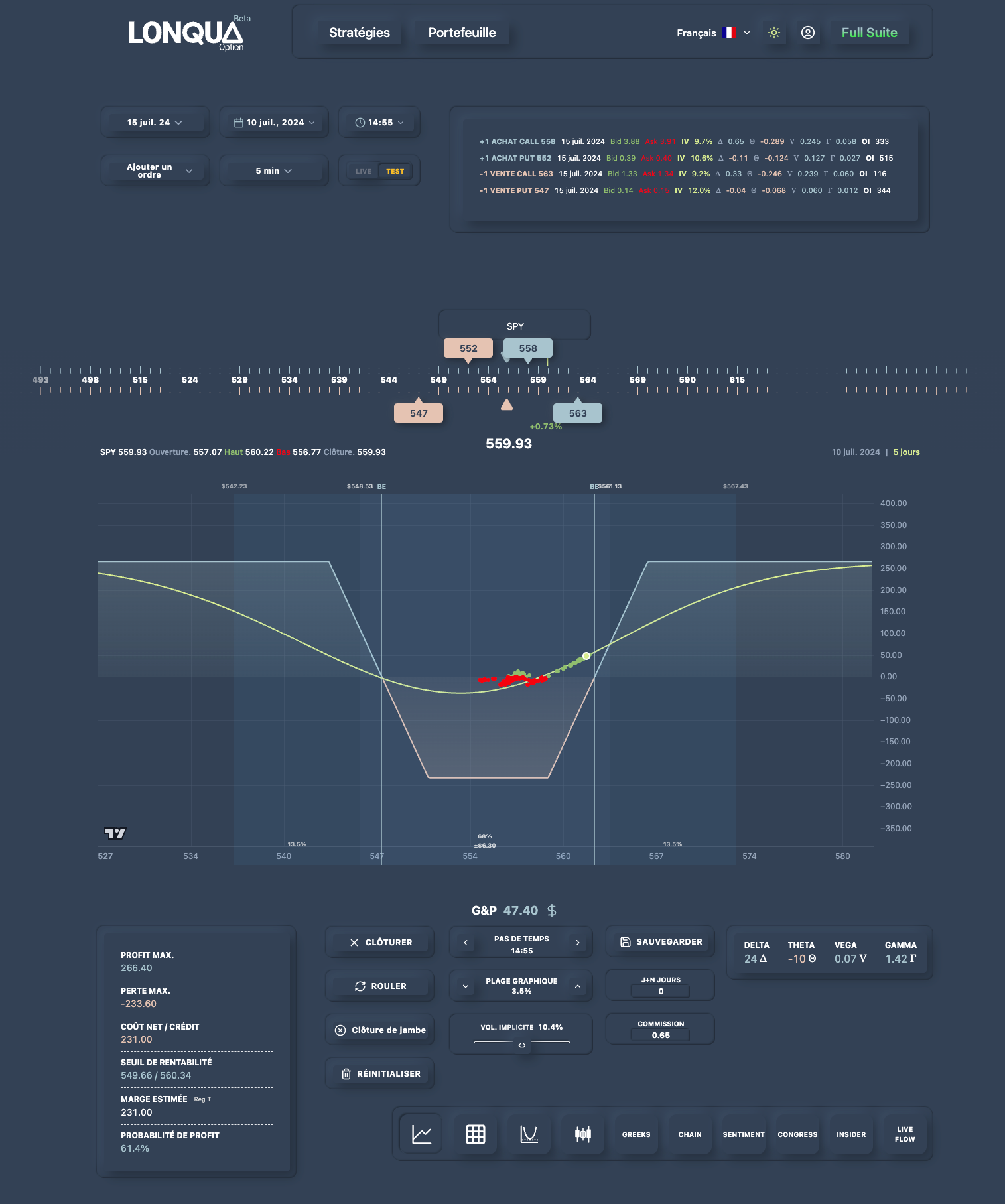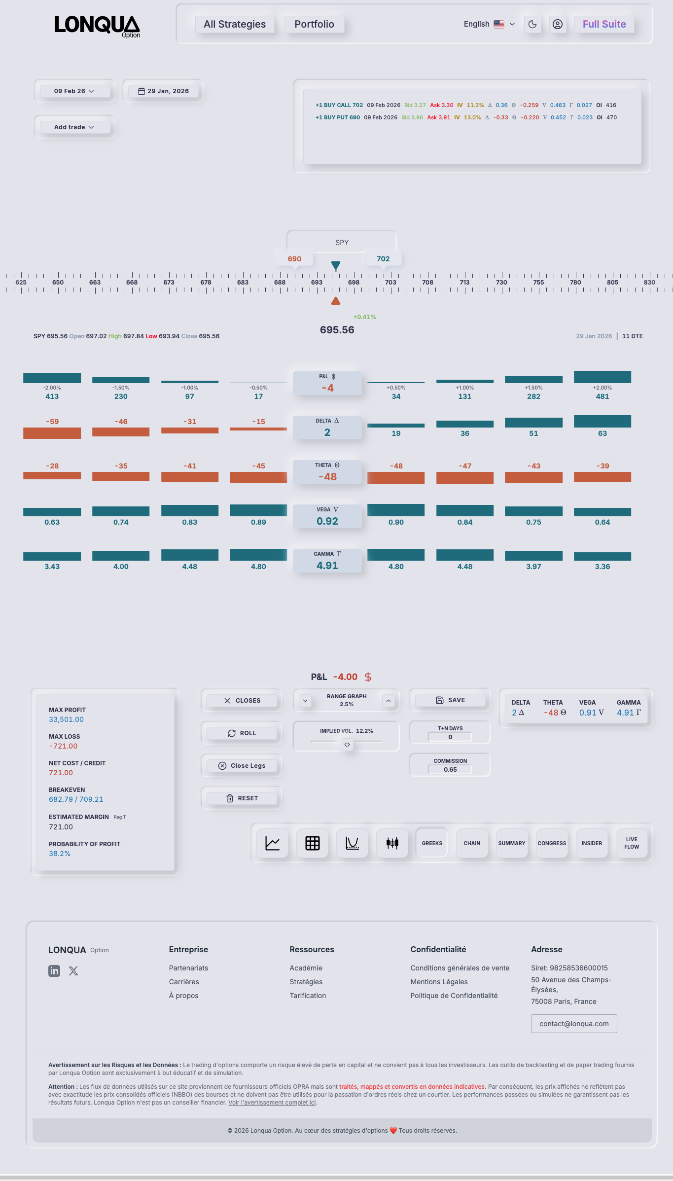 La démo ci-dessous n'offre qu'une fraction des fonctionnalités. La vraie expérience vous attend : un an de backtest SPY, simulations en données décalées 15 min, Greeks et P&L calculés en continu — aucune carte bancaire, gratuit pour toujours.
